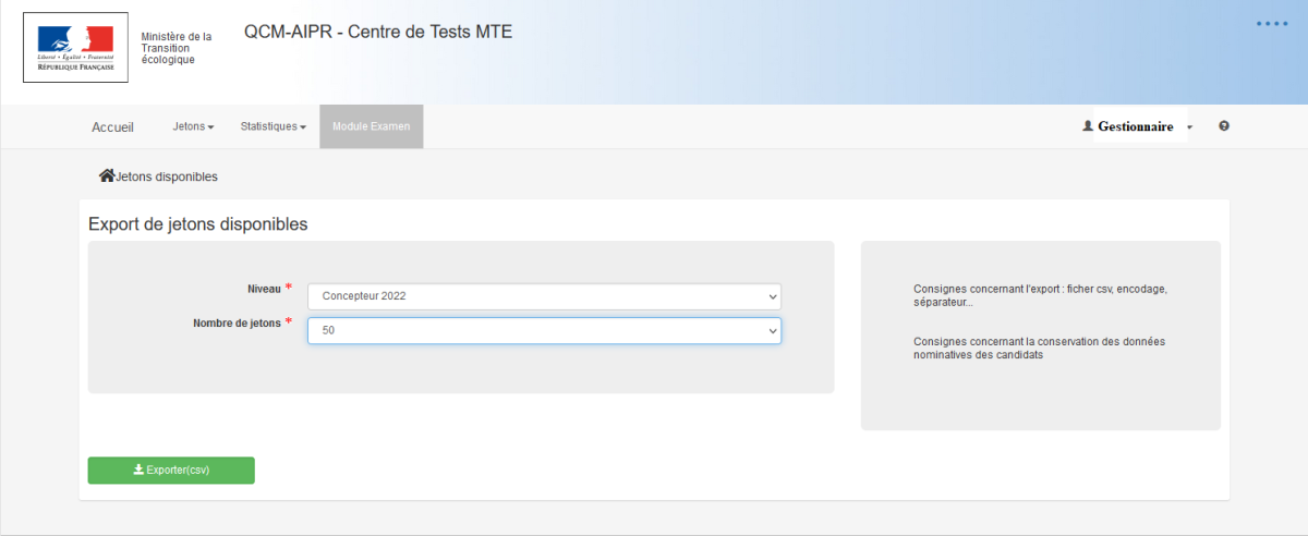permet d'exporter dans un fichier au format .csv, une liste de jetons disponibles (non encore utilisés pour passer des examens) selon :le niveau sélectionné (Concepteur 2022, Encadrant 2022, Opérateur 2022)