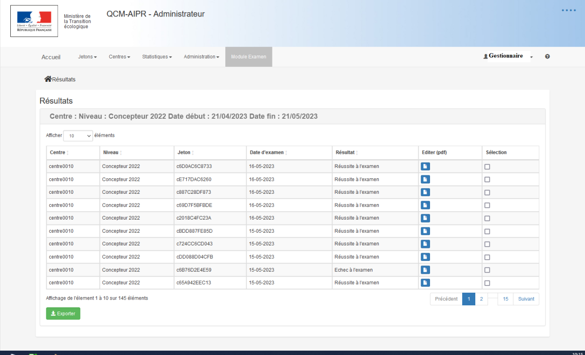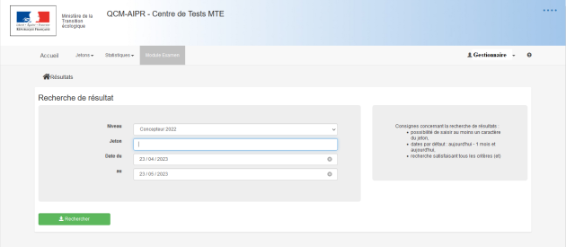 lance la recherche de résultats d'examen satisfaisant l'ensemble des critères sélectionnés et affiche le résultat de la recherche sous forme de tableau comprenant pour chaque jeton utilisé: